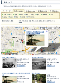 「資料マップ」では、地理院地図を利用して、資料画像をご覧になれます。 ※資料マップをご利用いただくためにはJavascriptを有効にする必要があります。 推奨ブラウザ以外は正しく表示することができない可能性がございます。 推奨ブラウザ Microsoft Edge 40 Internet Explorer 11以上 Firefox 55.0以上 Google Chrome 60.0以上 Safari 10.1以上 資料マップをみる |
